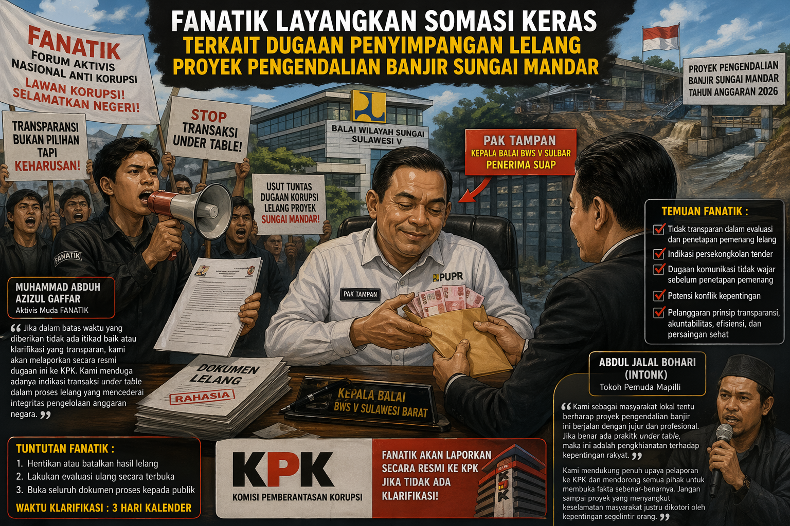 Jakarta— Forum Aktivis Nasional Anti Korupsi (FANATIK) secara resmi melayangkan surat somasi keras/peringatan terakhir kepada Kepala Balai BWS V Sulawesi Barat terkait dugaan penyimpangan dalam proses lelang proyek pembangunan pengendalian banjir Sungai Mandar Tahun Anggaran 2026.