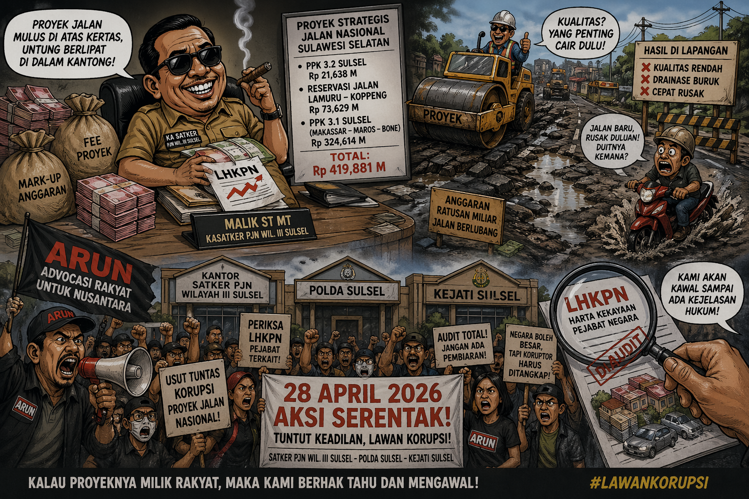 Makassar, 24 April 2026 — Dewan Pimpinan Daerah Advokasi Rakyat Untuk Nusantara (ARUN) Sulawesi Selatan memastikan akan menggelar aksi unjuk rasa besar-besaran sebagai bentuk perlawanan terhadap dugaan praktik korupsi sistemik dalam proyek jalan nasional di Sulawesi Selatan.
